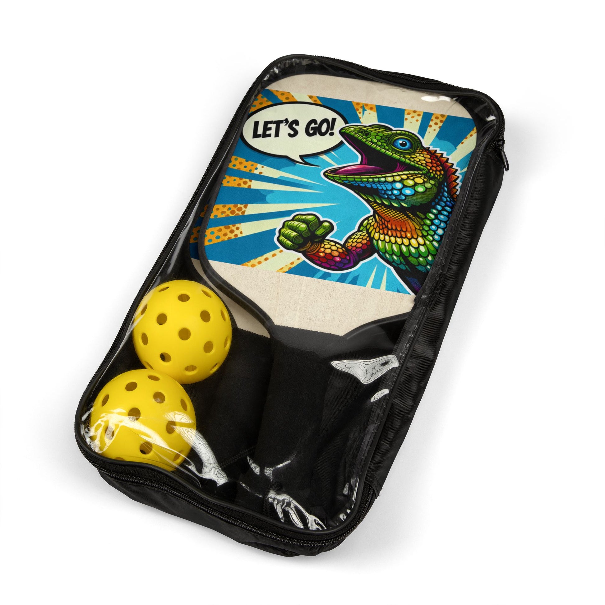 Připravit, nastavit, hrát! Naše vlastní sada pikleballu obsahuje vše, co potřebujete pro napínavý zápas: 2 pádla a 2 míčky. Tato sada je zabalena v praktickém průhledném sáčku pro snadnou přepravu a je ideální pro zábavu na cestách. Navíc s potiskem dostupným na obou stranách můžete při každém švihu předvést svůj jedinečný styl.